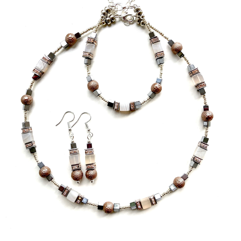 Here I have combined cubes and spheres for a subtly dynamic effect using translucent Agate cubes and silver-plated Hematite gemstones teamed with toning beige textured Pearls, all interspersed with sparkling rose-gold Rhinestone spacer beads, creating an easy to wear and flattering piece of jewellery.