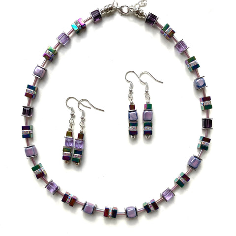 Created using lilac-coloured handmade Ceramic and crystal cubes coupled with rainbow-hued Hematite gemstones, sparkling rhinestone spacer beads and translucent amethyst bugle beads.