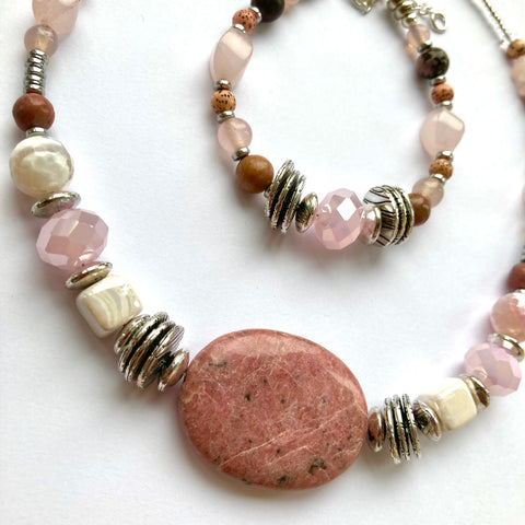 If you love semi-precious gemstones then you will love this design featuring Rhodochrosite gemstones surrounded by Rose Quartz and faceted Agate gemstones, pale pink Crystal rondelles and silver-plated Hematite rondelles, all combining to create an eye-catching statement piece.