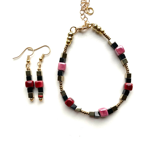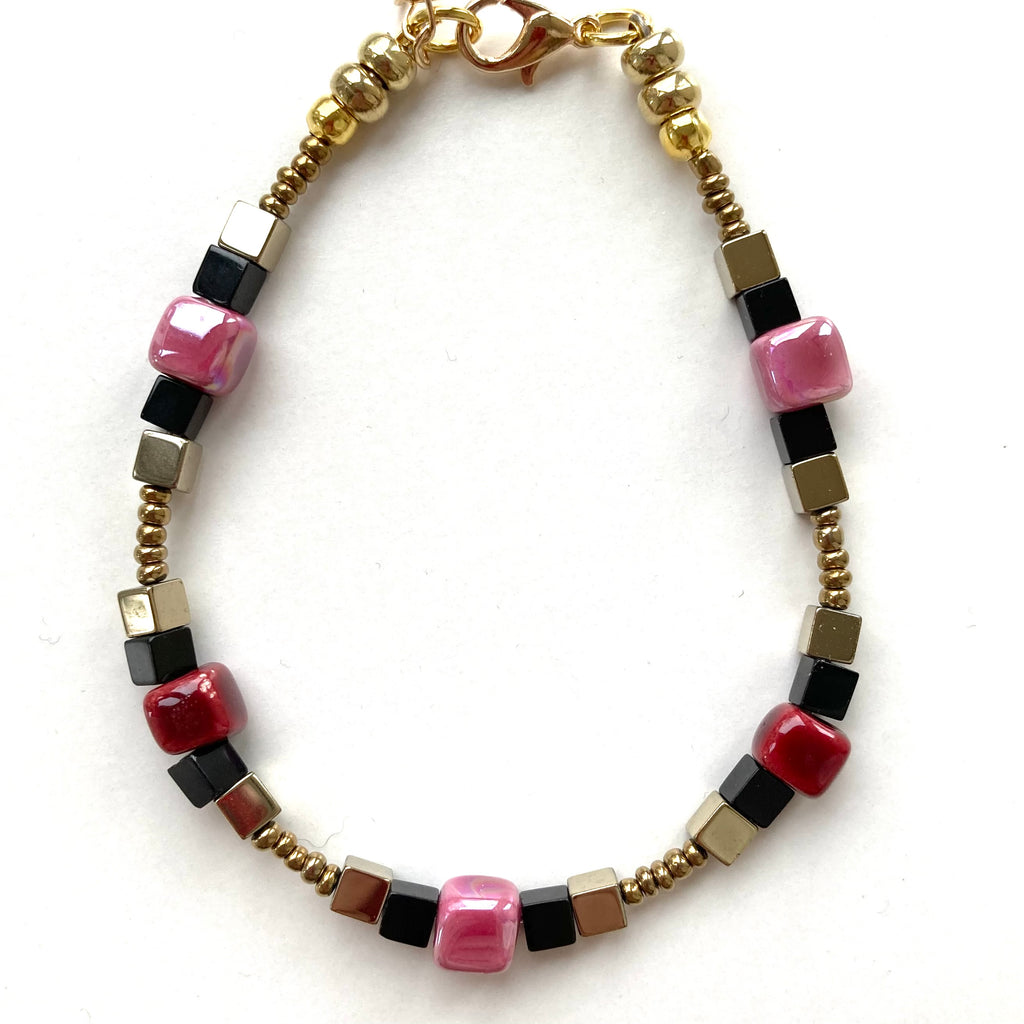 The handmade red and pink Ceramic cubes are complemented by little black and gold-plated Hematite cubes on each side, forming a pattern linked by antique gold seed beads