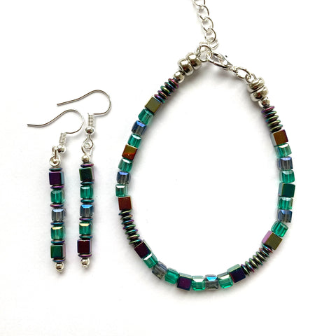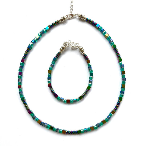 This design was inspired by the shifting colours of the sea on a beautiful summer’s day. It combines shades of green, aqua and blue faceted Crystal cubes with iridescent touches in the rainbow plated Hematite cubes and rondelles.