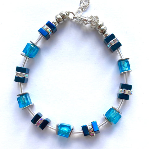 26108 comes with silver-lined Murano-style glass cubes in ocean blue complemented by Hematite gemstone squares in marine blue with the added sparkle of silver Rhinestone spacer beads.