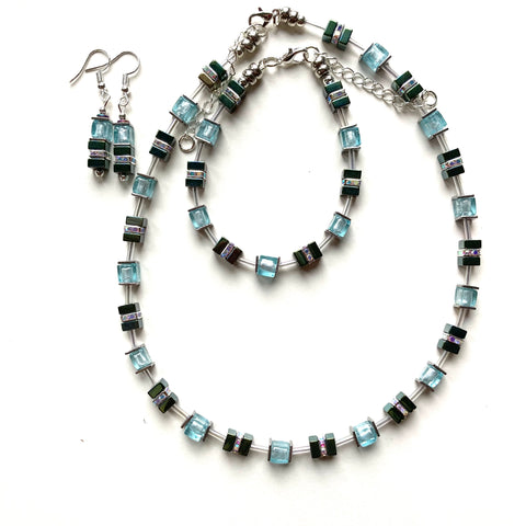 26107 comes with silver-lined Murano-style glass cubes in aqua, complemented by Hematite gemstone squares in sea green with the added sparkle of silver Rhinestone spacer beads.