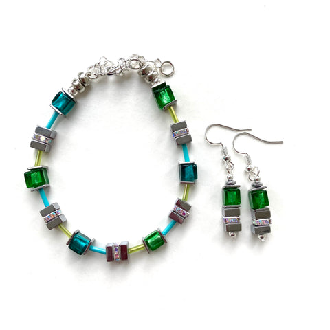 I have used bright green coloured cubes of Murano-style Glass to complement the silver-hued Hematite squares with the added sparkle of silver Rhinestone studded spacer beads in between.