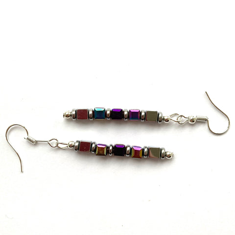 This sleek design is modern and sophisticated and will complement any outfit. It combines purple and rainbow faceted Crystal cubes with little silver Hematite rondelles and cubes, creating a pleasing rhythm with a hint of sparkle from the crystals. Perfect for either daytime or evening.