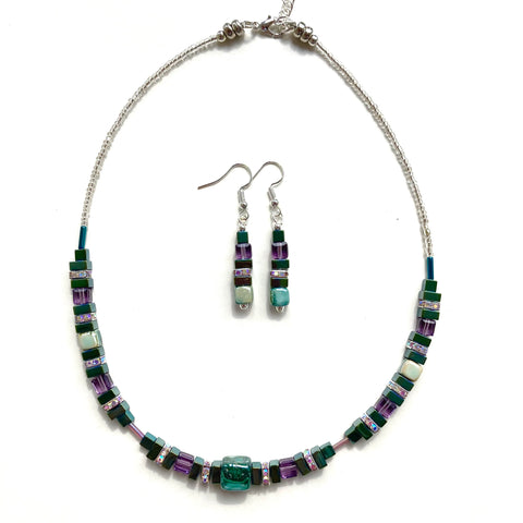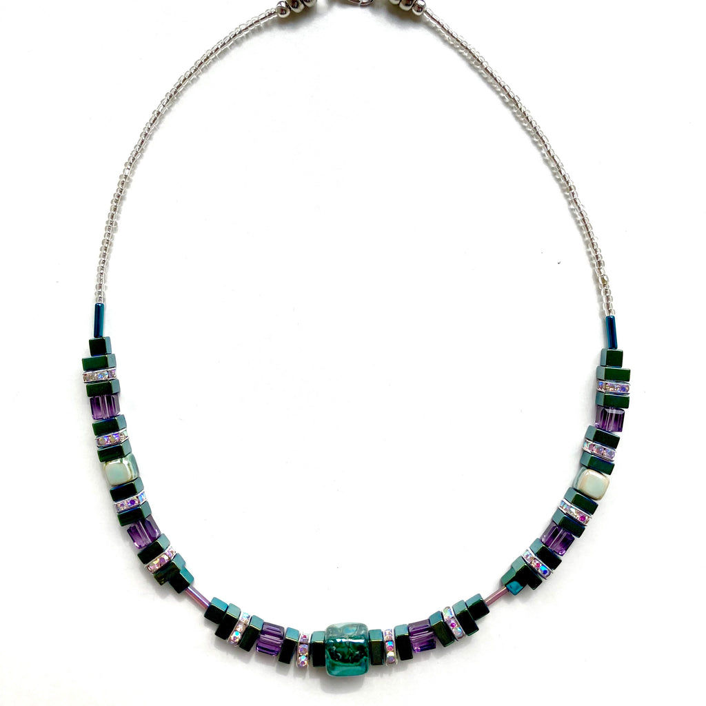 The green-plated Hematite squares and cubes harmonise with the handmade mottled green Ceramic cubes while the faceted purple Crystals create a lovely contrast and a translucent sheen while the Rhinestone spacer beads add a touch of sparkle.