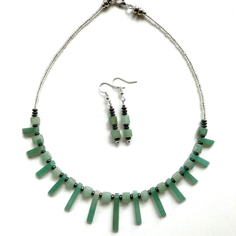 Aventurine is a lovely slightly translucent green gemstone which is very flattering. The little rainbow-plated Hematite rondelles contrast nicely with the green stone and the shape of the fan accentuates its natural beauty.